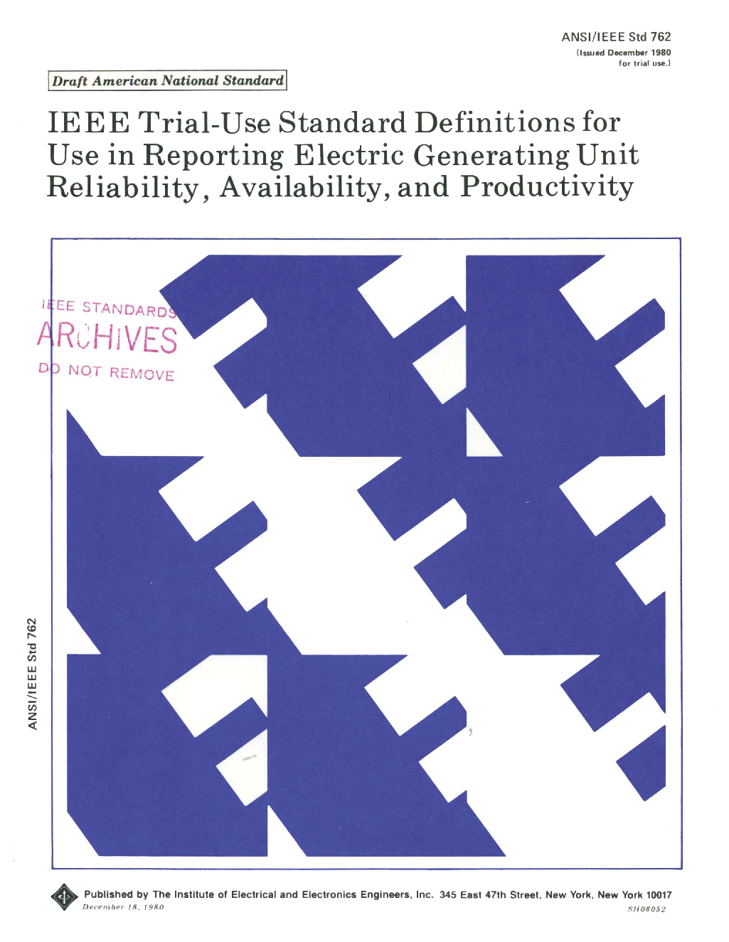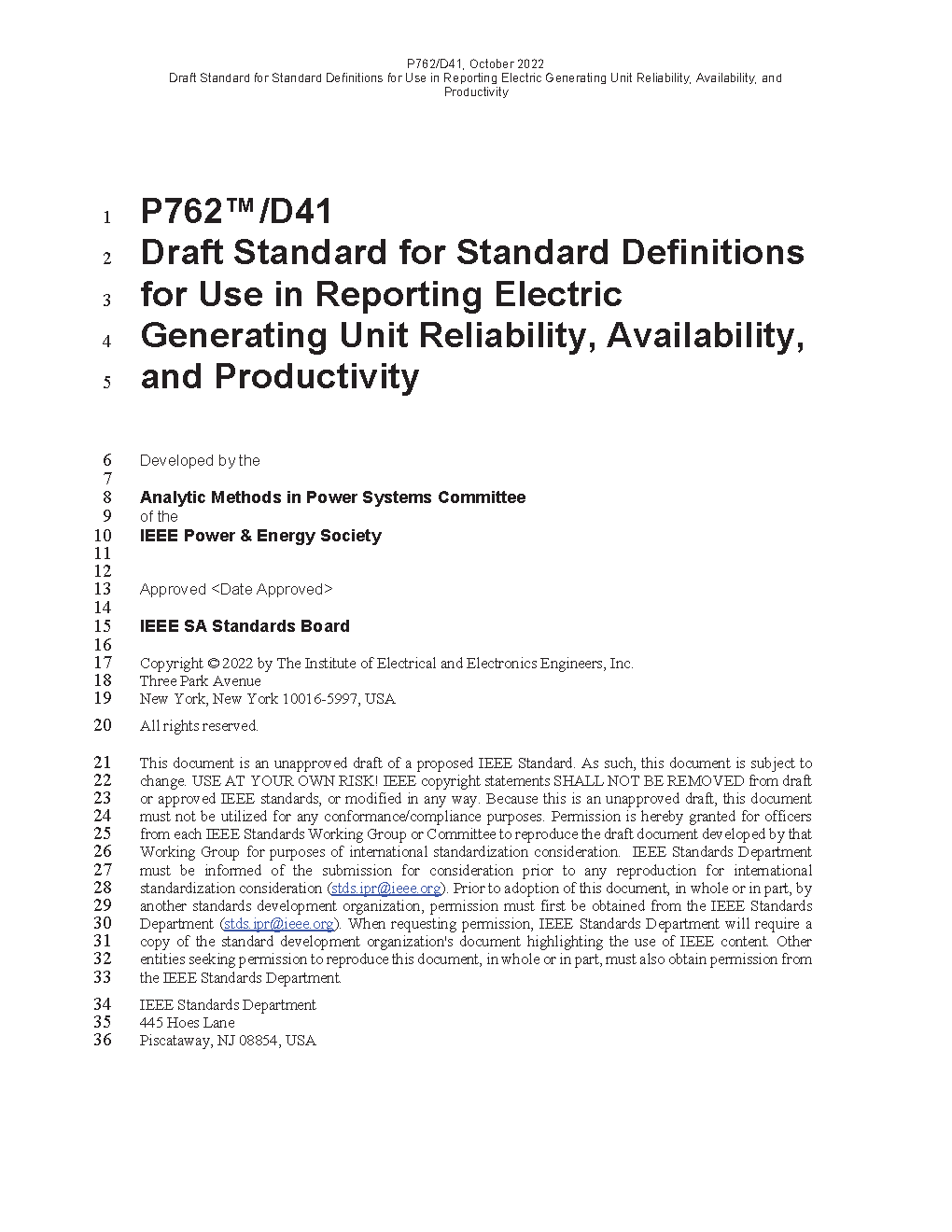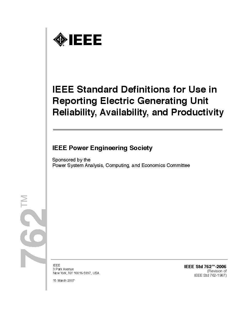 This document standardizes terminology and indexes for reporting electric generating unit reliability, availability, and productivity performance measures. A generating unit includes all equipment up to the high-voltage terminal of the generator step-up transformer. Reliability in this standard encompasses measures of the ability of generating units to perform their intended function. Availability measures are concerned with the fraction of time a unit is capable of providing service, and account for outage frequency and duration. Productivity measures are concerned with the total power produced by a plant with respect to its potential power production. Therefore, productivity measures consider magnitude of outage as well as frequency and duration of outage