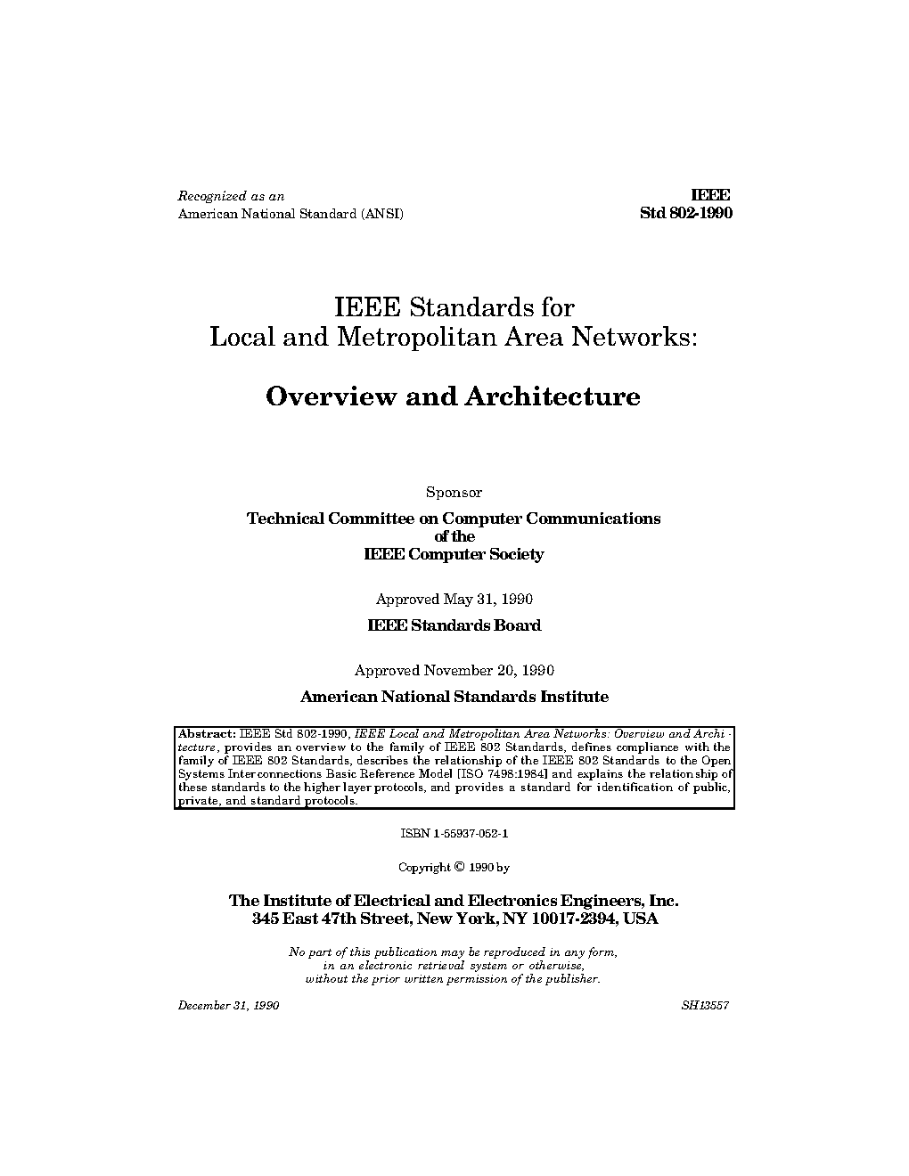 Superseded by IEEE Std 802-2001 This IEEE Standards product is part of the 802 family on LAN/MAN. This document provides an overview to the family of IEEE 802 Standards, defines compliance with the family of IEEE 802 Standards, describes the relationship of the IEEE 802 Standards to the Open Systems Interconnections Basic Reference Model [ISO 7498:1984] and explains the relationship of these standards to the higher layer protocols, and provides a standard for identification of public, private, and standard protocols.