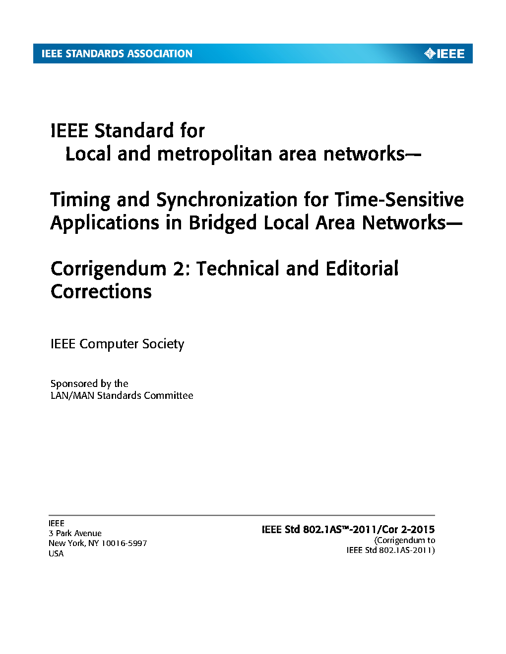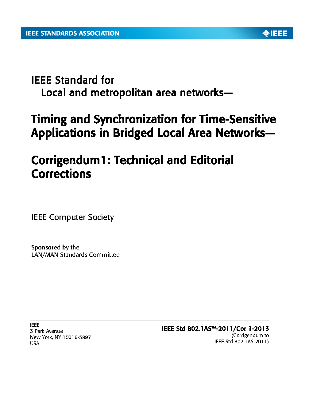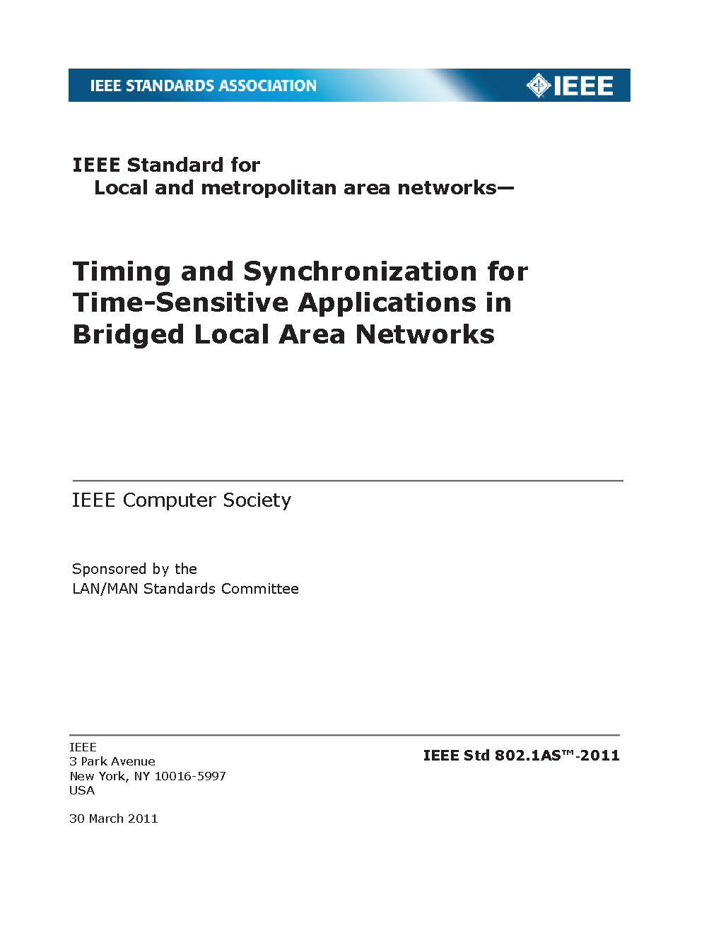This standard specifies the protocol and procedures used to ensure that the synchronization requirements are met for time-sensitive applications, such as audio and video, across bridged and virtual bridged local area networks consisting of local area network (LAN) media where the transmission delays are fixed and symmetrical; for example, IEEE 802.3 full-duplex links. This includes the maintenance of synchronized time during normal operation and following addition, removal, or failure of network components and network reconfiguration. It specifies the use of IEEE 1588 specifications where applicable in the context of IEEE Std 802.1D-2004 and IEEE Std 802.1Q-2005.1 Synchronization to an externally provided timing signal (e.g., a recognized timing standard such as UTC or TAI) is not part of this standard but is not precluded.