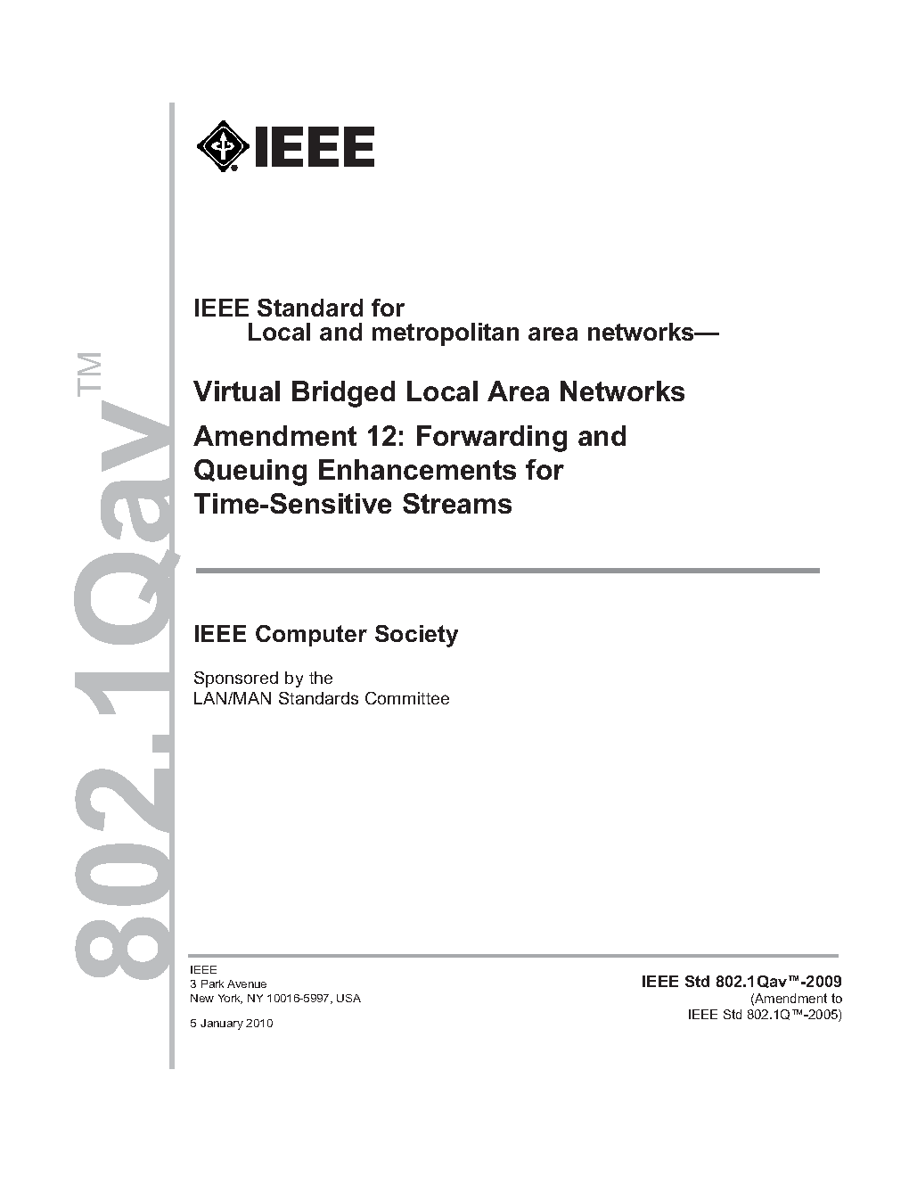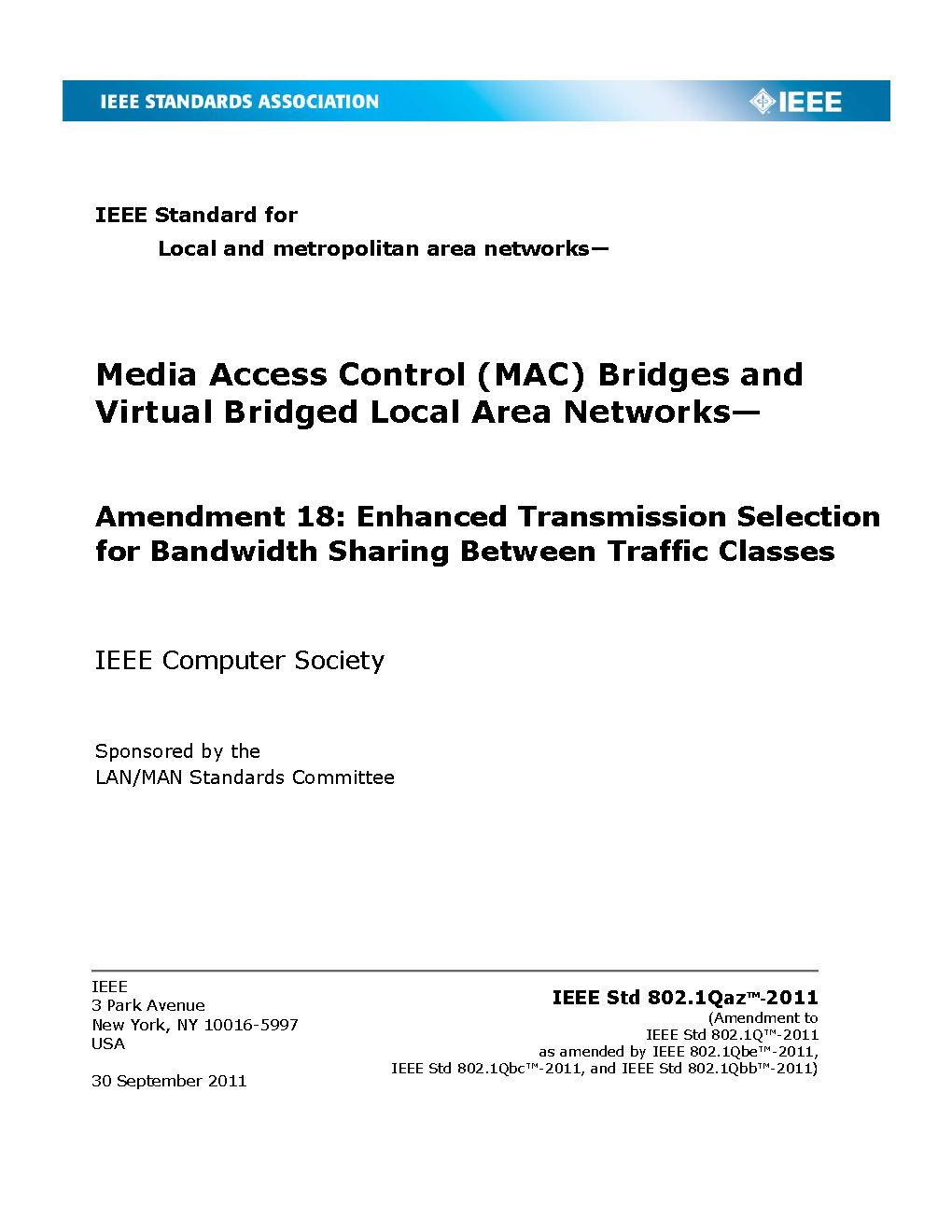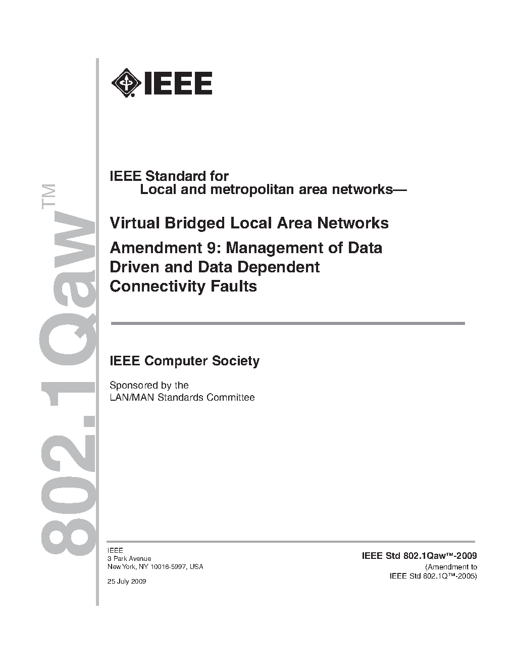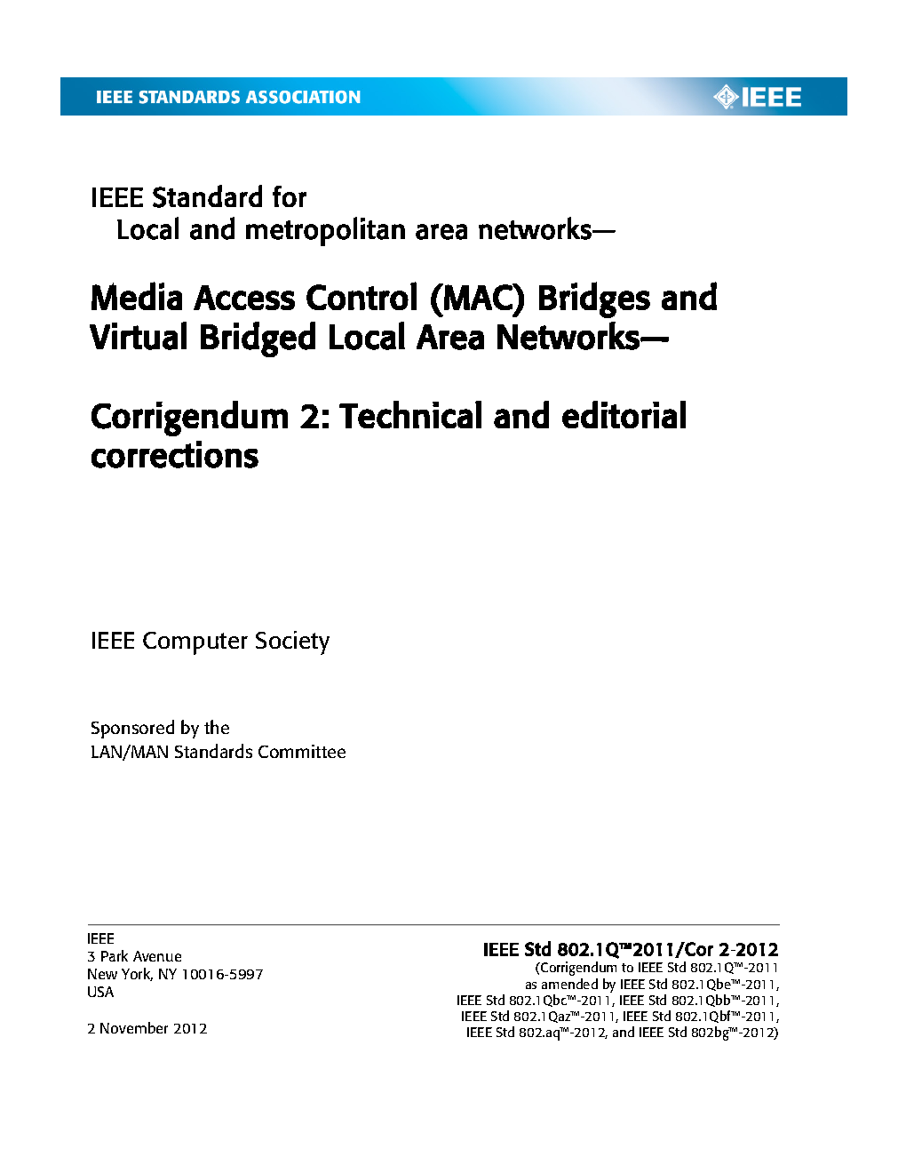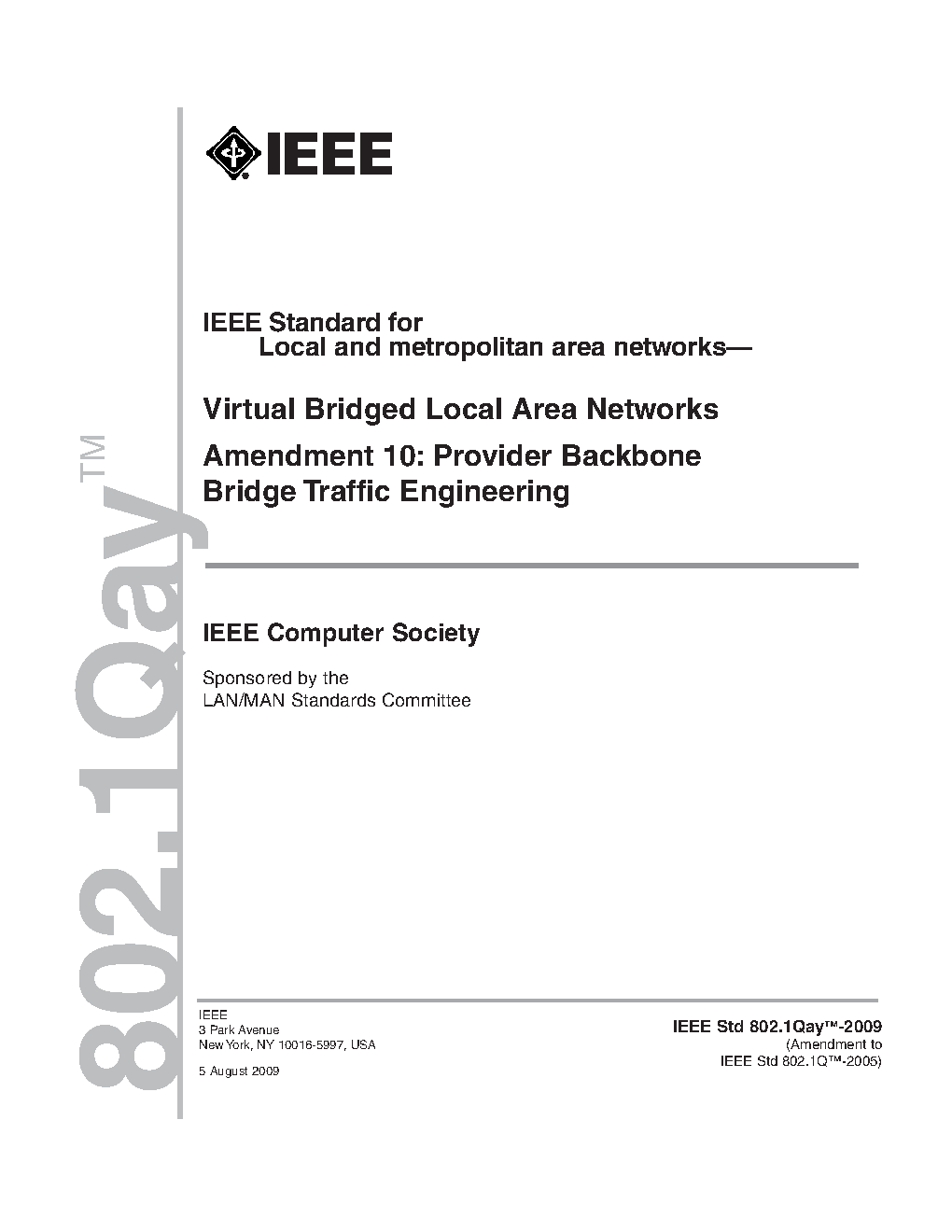 Incorporates IEEE Std 802.1Q-2005, IEEE Std 802.1ad-2005, IEEE Std 802.1ak-2007, IEEE Std 802.1ag-2007, IEEE Std 802.1ah-2008, IEEE Std 802-1Q-2005/Cor-1-2008, IEEE Std 802.1ap-2008, IEEE Std 802.1Qaw-2009, IEEE Std 802.1Qay-2009, IEEE Std 802.1aj-2009, IEEE Std 802.1Qav-2009, IEEE Std Qau-2010, and IEEE Std Qat-2010.