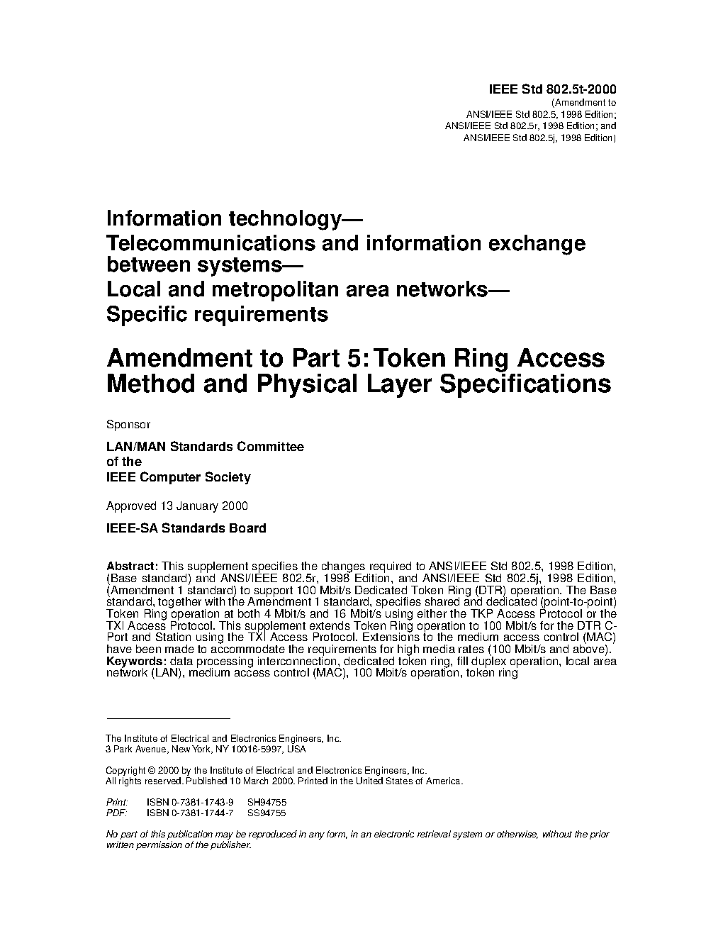 IEEE Corrigenda to Standard for Information Technology - Telecommunications and information exchange between systems - Local and metropolitan area networks - Part 5: Token Ring access method and physical layer specifications