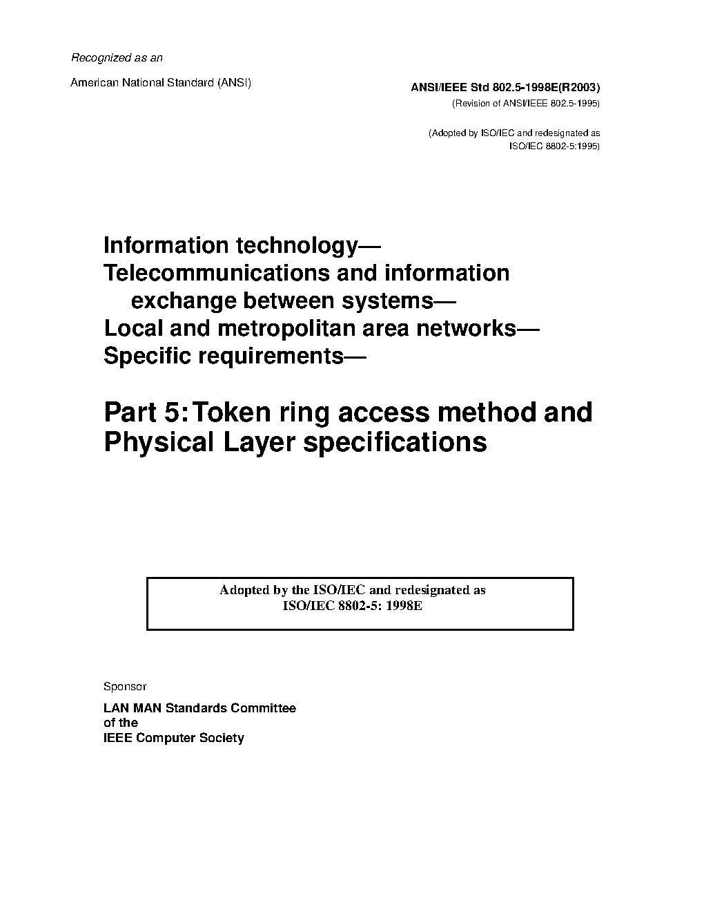 Withdrawn September 2008. This corrigendum to Local and Metropolitan Area Network standards, IEEE Std 802.5, 1998 Edition and IEEE Stds 802.5r and 802.5j, 1998 Edition, is part of a family of local area net-work (LAN) standards dealing with the physical and data link layers as defined by the ISO/IEC Open Systems Interconnection Basic Reference Model. Errors that have been identified in the two standards are corrected.