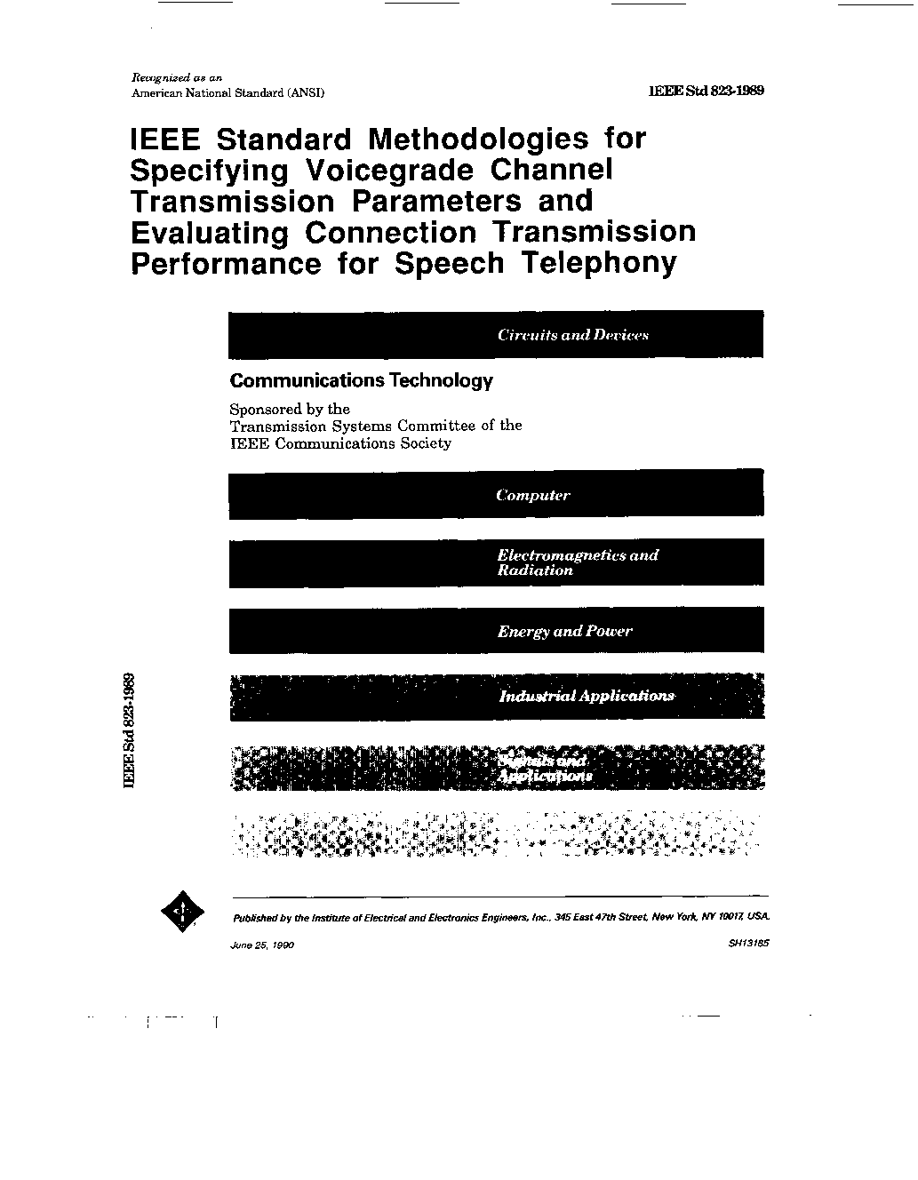 Withdrawn Standard. Withdrawn Date: Dec 13, 1994. No longer endorsed by the IEEE. This standard provides network planners with the methodology and models for specifying the transmission performance of voicegrade communications channels, calculating the transmission performance of voicegrade connections made up of one channel, or of two or more voicegrade channels connected in tandem, calculating the resulting speech transmission performance, and determining the grade of service of a complete voice connection, including the terminals (telephone sets), and evaluating the relative transmission performance of alternative speech connections.