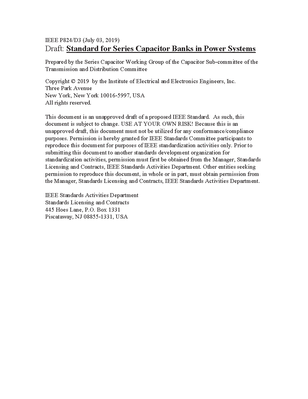 Capacitors and assemblies of capacitors, insulation means, switching, protective equipment, and control accessories that form a complete bank for inserting in series with a transmission line are applied. Included are requirements for safety, rating, and protective device levels. Functional requirements for alarm devices, maintenance, design and production tests, and a guide for operation are included. Functional requirements for protective devices are addressed, including varistors and bypass gaps.