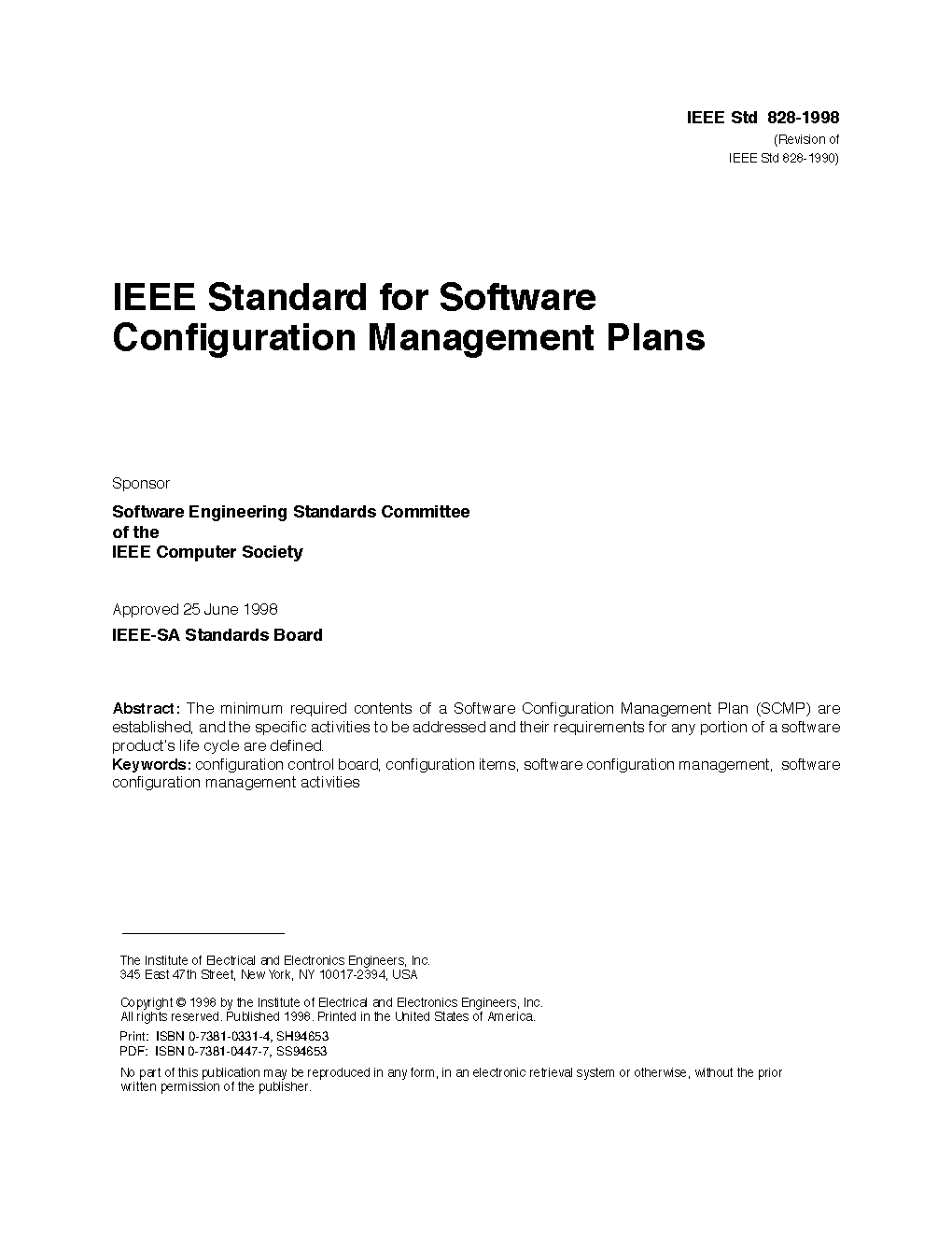 This standard establishes the minimum requirements for processes for Configuration Management (CM) in systems and software engineering. The application of this standard applies to any form, class, or type of software or system. This revision of the standard expands the previous version to explain CM, including identifying and acquiring configuration items, controlling changes, reporting the status of configuration items, as well as software builds and release engineering. Its predecessor defined only the contents of a software configuration management plan. This standard addresses what CM activities are to be done, when they are to happen in the life cycle, and what planning and resources are required. It also describes the content areas for a CM Plan. The standard supports ISO/IEC/IEEE 12207:2008 and ISO/IEC/IEEE 15288:2008 and adheres to the terminology in ISO/IEC/IEEE Std 24765 and the information item requirements of IEEE Std 15939TM