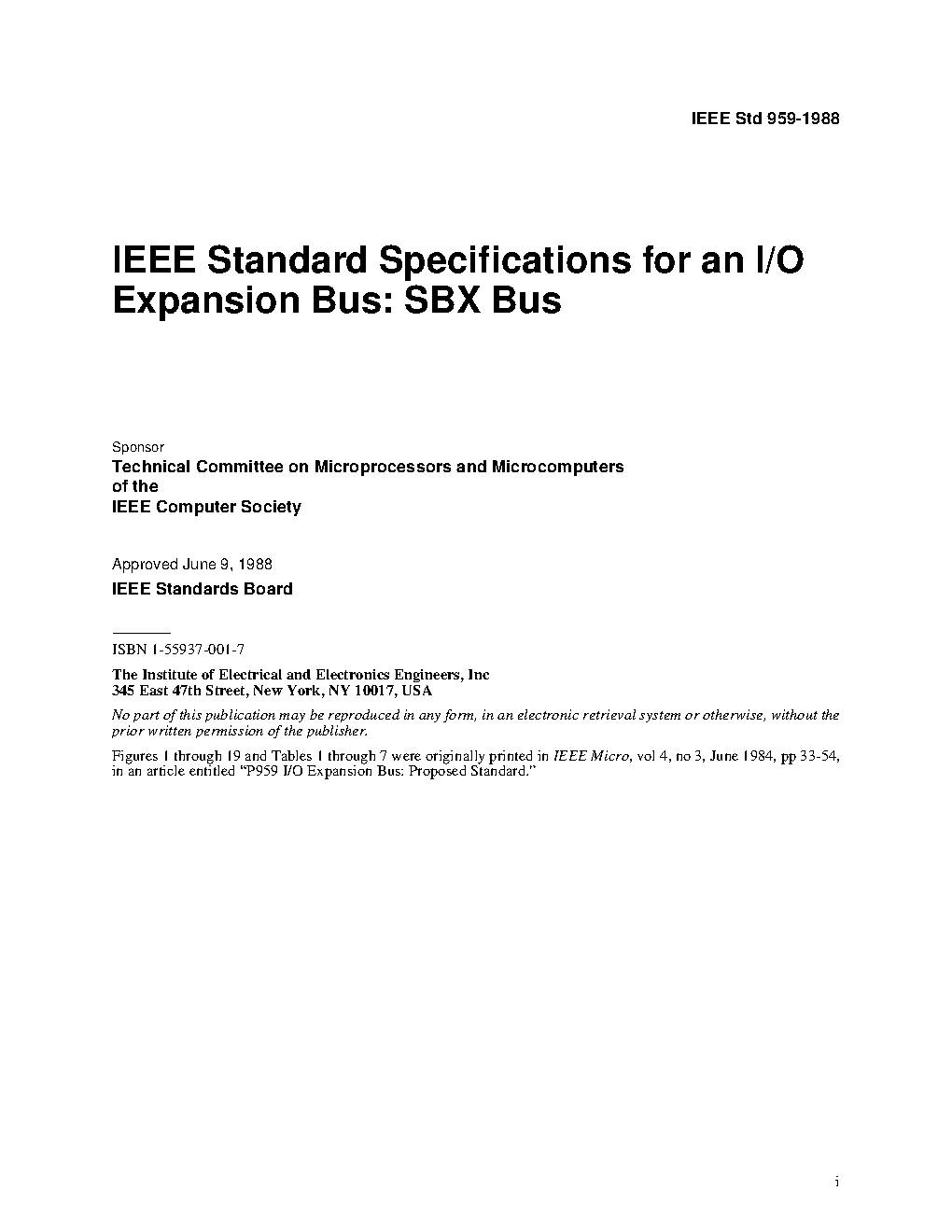 One of the most important parts of any computer system is the I/O. Many systems require different types of I/O depending on the specific application. In addition, the system designer is faced with a significant challenge to keep up with new technology in I/O devices types, interfaces, and the LSI components designed to support them. The IEEE 959 I/O expansion bus is designed to address these needs. Using this standard interface allows small increments of I/O to be added or modified in an easy, cost-effective way. The IEEE 959 I/O expansion bus is specified independent of processor or board type. Each expansion interface supports up to sixteen 8-bit I/O ports directly. Enhanced addressing capability is available using slave processors or FIFO devices. In addition, each expansion interface may optionally support a DMA channel capable of data rates up to 2 16-bit Mwords/sec. These features are supported for both 8- and 16-bit data paths. This specification has been prepared for those users who intend to design or evaluate products that will be compatible with the IEEE 959 I/O expansion bus. For this purpose, functional, electrical, and mechanical specification are covered in detail. The intent of the specification is to guarantee compatibility between baseboards and expansion modules while not restricting the actual designs any more than necessary. Additional design considerations that are not part of the actual specification are presented in the appendixes.