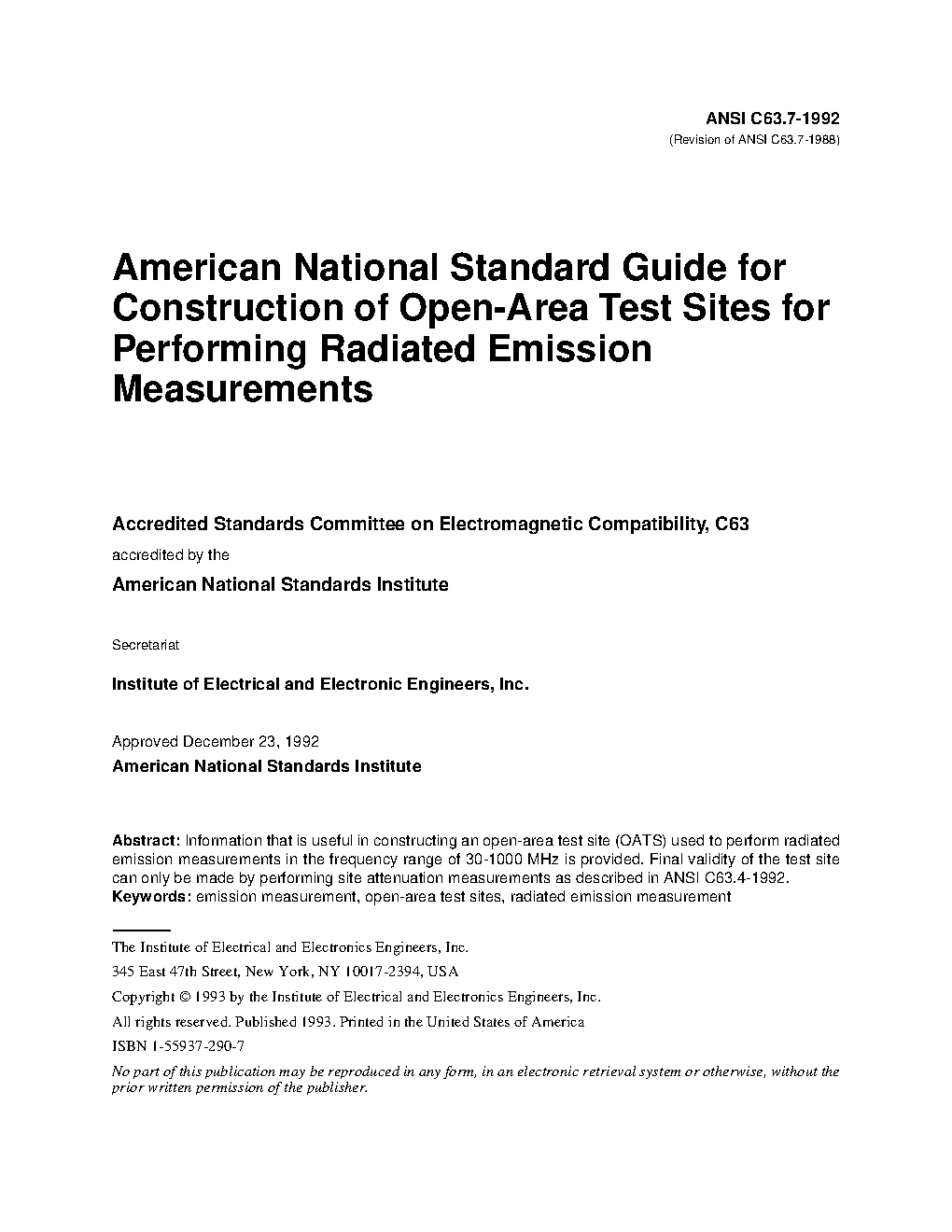 This guide provides information that is useful in constructing an open-area test site (OATS) used to perform radiated emission measurements in the frequency range of 30-1000 MHz. Final validity of the test site can only be made by performing site attenuation measurements as described in ANSI C63.4-2003, Sec 5.4.6.