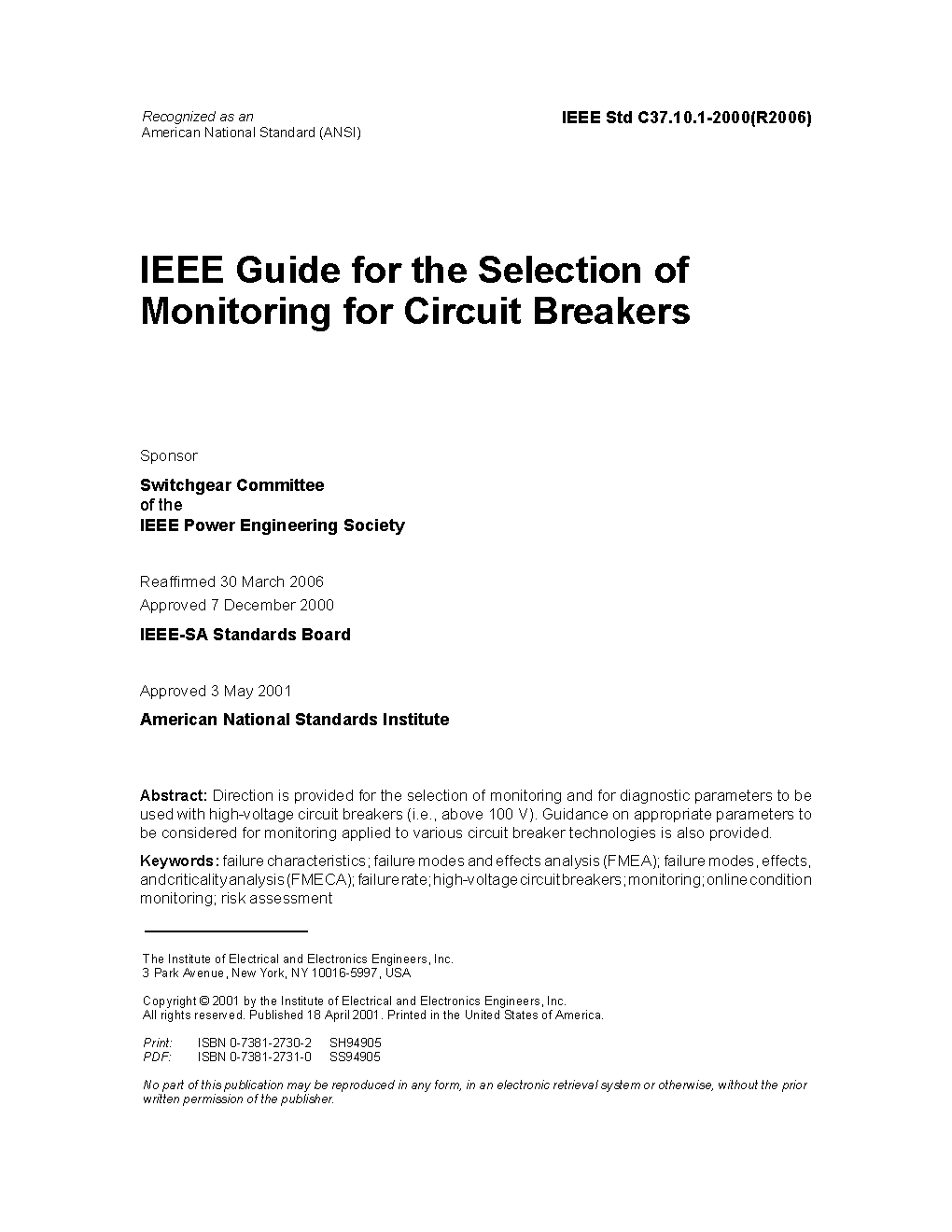This IEEE Standards product is part of the C37 family on Switchgear, Substations and Protective Relays. Direction is provided for the selection of monitoring and for diagnostic parameters to be used with high-voltage circuit breakers (i.e., above 100 V). Guidance on appropriate parameters to be considered for monitoring applied to various circuit breaker technologies is also provided.