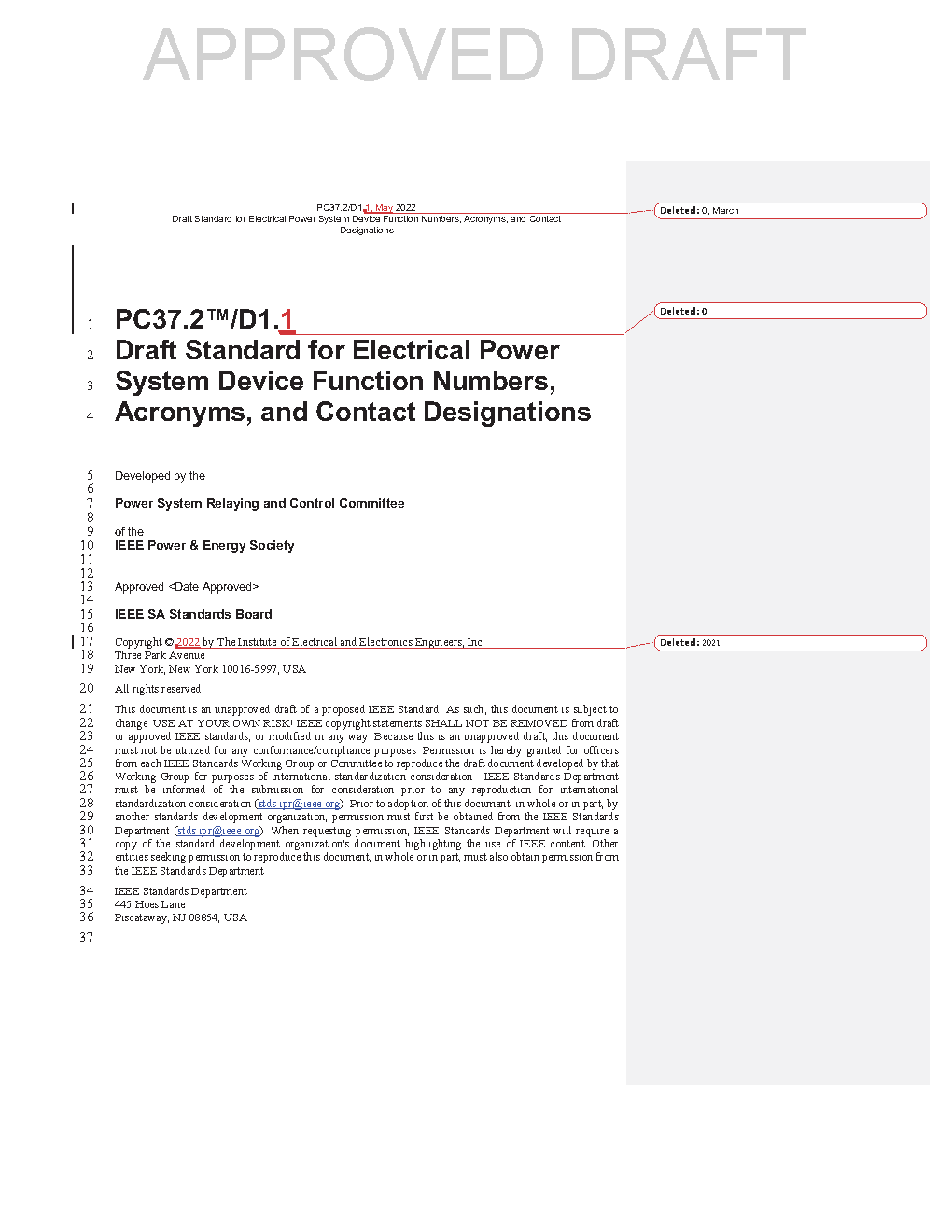 A device function number, with an appropriate prefix and suffix where necessary, is used to identify the function of each device in all types of switchgear. These numbers are to be used in drawings, elementary and connection diagrams, instruction books, publications, and specfications. In addition, the number may be placed on, or adjacent to, each device on the assembled equipment so the device may be readily identified. This PAR is proposed to revise C37.2-1991 to reflect current technology and usage.