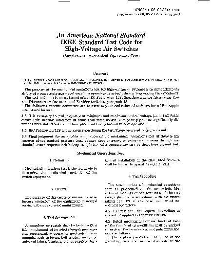 This standard summarizes various design tests that shall be made on all types of high-voltage enclosed indoor or outdoor and non-enclosed indoor or outdoor air switches, and describes accepted methods used in making these tests. For tests on apparatus insulators, see ANSI C29.1-1988.1 High-voltage air switches in IEEE Std C37.20.2-1987, IEEE Std C37.20.3-1987, IEEE Std C37.71-1984, and ANSI C37.72-1987 are not covered by this standard.