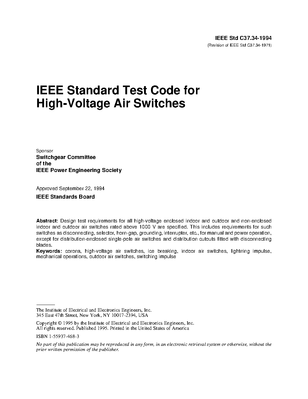 Design test requirements for all high-voltage enclosed indoor and outdoor and non-enclosed indoor and outdoor air switches rated above 1000 V are specified. This includes requirements for such switches as disconnecting, selector, horn-gap, grounding, interrupter, etc., for manual and power operation, except for distribution-enclosed single-pole air switches and distribution cutouts fitted with disconnecting blades.(Superseded by IEEE Std C37.30.1-2011)