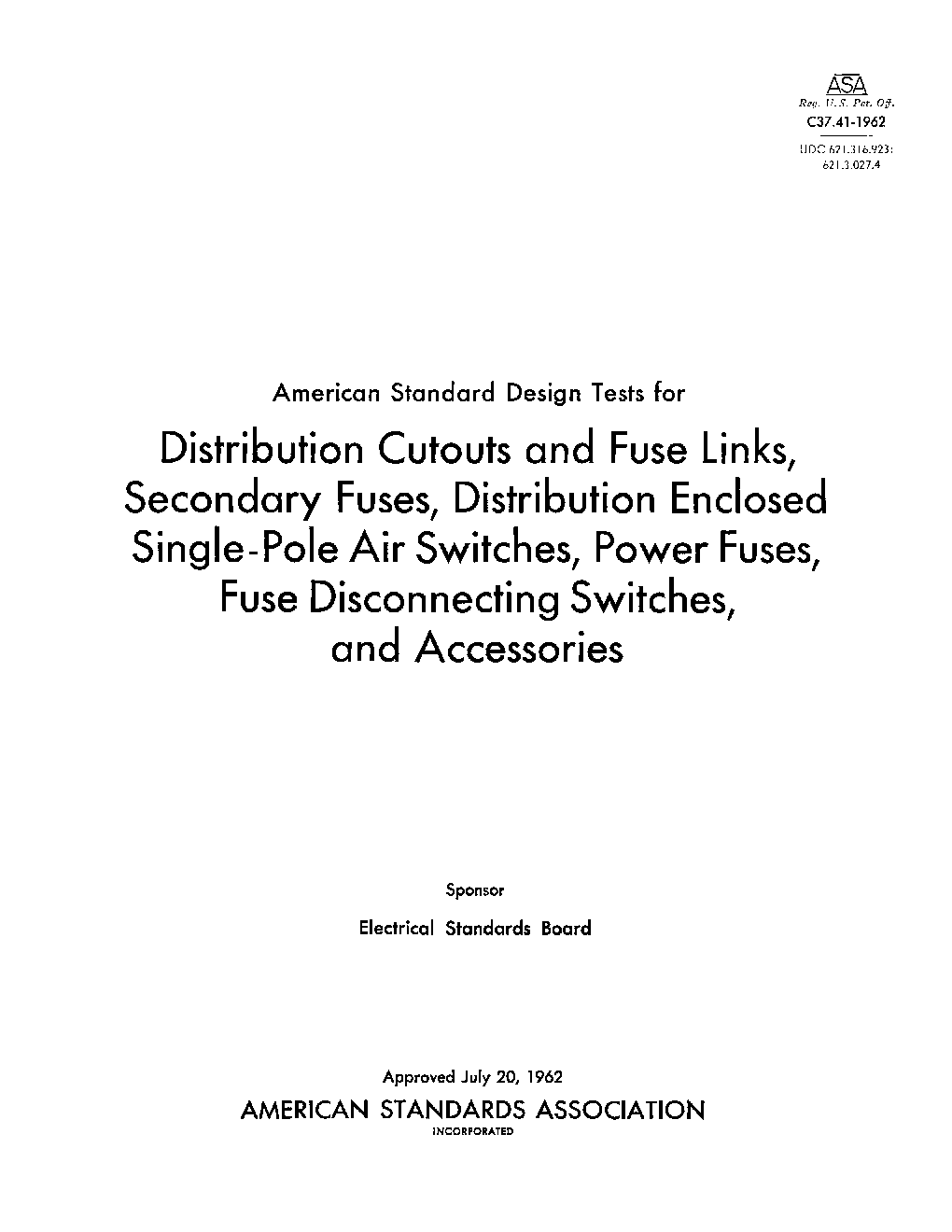 Superseded. Tests for high-voltage fuses (above 600 V), distribution enclosed single-pole air switches, fuse disconnecting switches, and accessories (for AC distribution systems) are covered. These include enclosed, open, and open-link types of distribution cutouts and fuses; distribution current-limiting fuses; distribution oil cutouts; distribution enclosed single-pole air switches; power fuses, including current-limiting types; outdoor and indoor fuse disconnecting switches; fuse supports, fuse mountings, fuse hooks, fuse tongs, and fuse links of the type used exclusively with the above products; and removable switch blades for certain of the above.