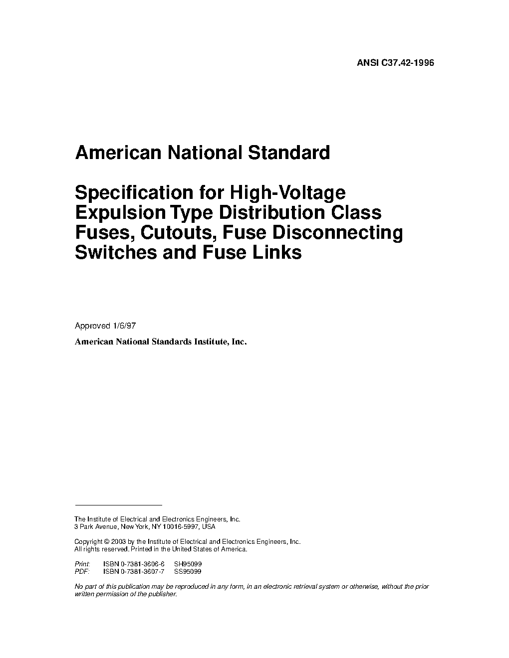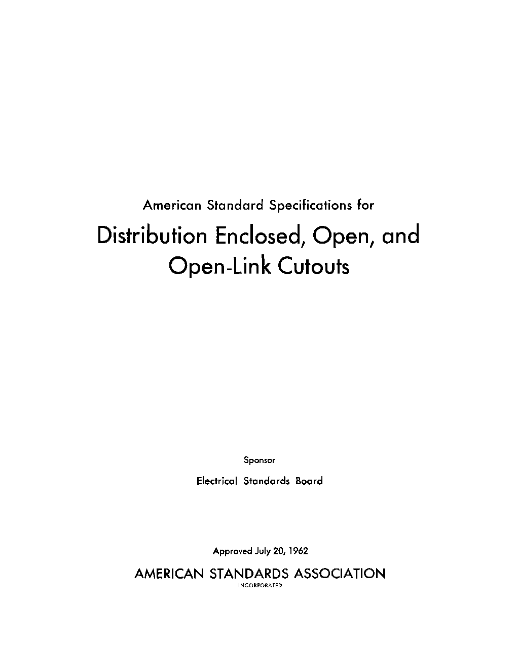 This standard establishes specifications for high voltage (above 1000 volts) expulsion type distribution class fuses, fuse cutouts, fuse disconnecting switches, their associated fuse links and disconnecting cutouts, and accessories for these devices. All of these devices are intended for use on alternating current distribution systems. These specifications apply to the following specific types of equipment: a) Open and enclosed types of fuses and fuse cutouts b) Open and enclosed fuse disconnecting switches c) Fuse links of the type used exclusively with distribution class fuses, fuse cutouts, and fuse disconnecting switches. d) Open-link types of fuses, cutouts, and their associated fuse links e) Open and enclosed types of disconnecting cutouts f) Fuse supports, fuse mountings and fuse hooks of the type used exclusively with distribution class fuses, fuse cutouts, fuse disconnecting switches, and disconnecting cutouts. g) Fuse holders and removable switch blades of the type used exclusively with distribution class fuse supports. h) Mounting brackets used for distribution class equipment and other accessories.