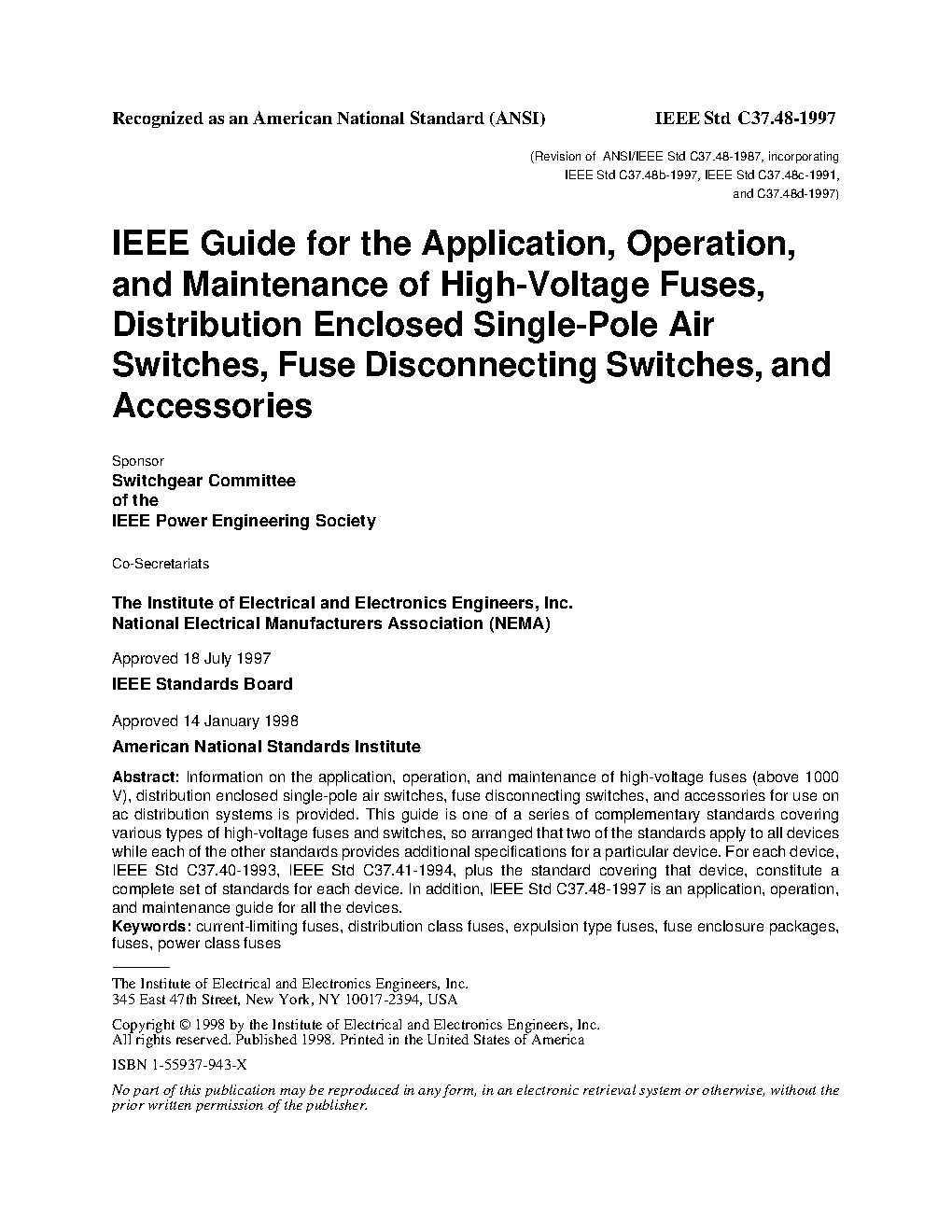 IEEE Guide for Application, Operation, and Maintenance of High-Voltage Fuses, Distribution Enclosed Single-Pole Air Switches, Fuse Disconnecting Switches, and Accessories