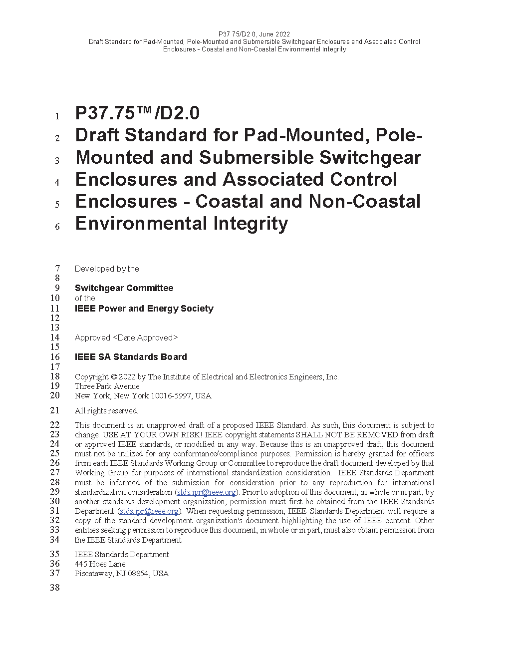 This standard includes conformance tests and requirements for the enclosure integrity of pad-mounted, pole-mounted, and submersible distribution switchgear rated above 1 kV, up to and including 38 kV as well as the enclosure integrity of the associated controls. This standard applies to enclosure security and coating requirements for coastal and non-coastal environments