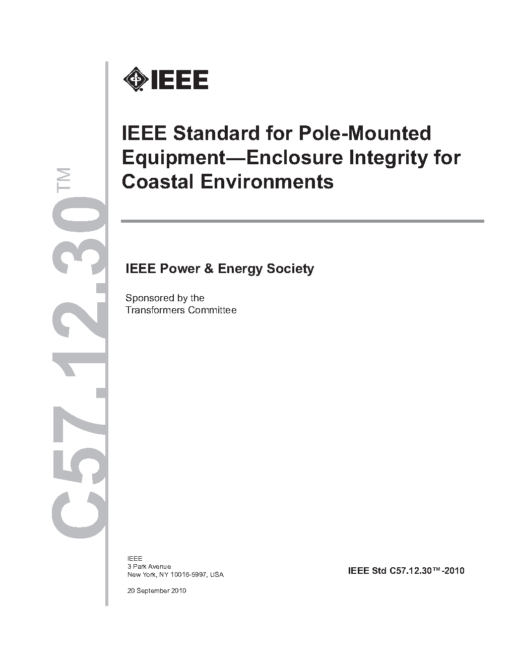 This standard covers conformance tests and requirements for the enclosure integrity of pole-mounted equipment for installations in coastal environments, containing apparatus energized in excess of 600 V, typically not accessible to the general public, such as but not limited to the following types of equipment: