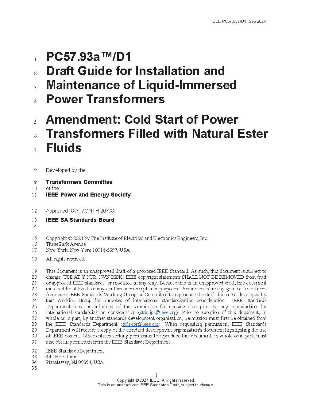 This guide provides guidance and recommended practices on the installation and maintenance of liquid-immersed power transformers rated 501 kVA and above with secondary voltages of 1000 V and above. This guide covers the entire range of power transformers, including extra high voltage (EHV) transformers. This guide does not cover special transformers such as furnace transformers, rectifier transformers etc. Distinctions are made as required for various MVA ratings, voltage ratings, and types of liquid insulation.