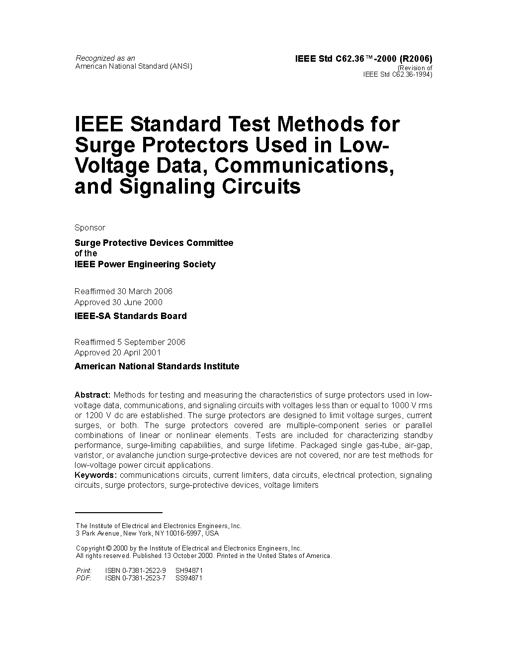 This standard applies to surge protectors for application on multiconductor balanced or unbalanced information and communications technology (ICT) circuits and smart grid data circuits. These surge protectors are designed to limit voltage surges, current surges, or both. The surge protectors covered are generally multiple-component series or parallel combinations of linear or nonlinear elements, packaged or organized for the purpose of limiting voltage, current, or both. This standard describes the methods of testing and criteria (where appropriate) for the characteristics and ratings of surge protectors used in ICT circuits and smart grid data circuits. This standard is not intended to cover packaged single gas tube, air gap, varistor, avalanche junction, or self-restoring current limiter surgeprotective components (SPCs), which are covered by IEEE Std C62.31 [B20], IEEE Std C62.32 [B21], IEEE Std C62.33 [B22], IEEE Std C62.35 [B23], and IEEE Std C62.39 [B24], respectively. Specifically excluded from this standard are test methods for low-voltage power circuit applications. For protection of wire-line communication facilities under the specialized conditions found at power stations, consult IEEE Std 487 [B16] series of documents.