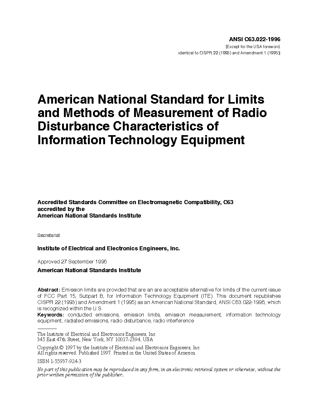 The CISPR 22 standard provides emission limits that are an acceptable alternative for limits of the current issue of FCC Part 15, Subpart B, for Information Technology Equipment (ITE). This document republishes CISPR 22 as an American National Standard, ANSI C63.022-1996, which is recognized within the U.S. This is a first step towards achieving commonality between ANSI C63 standards and international standards.