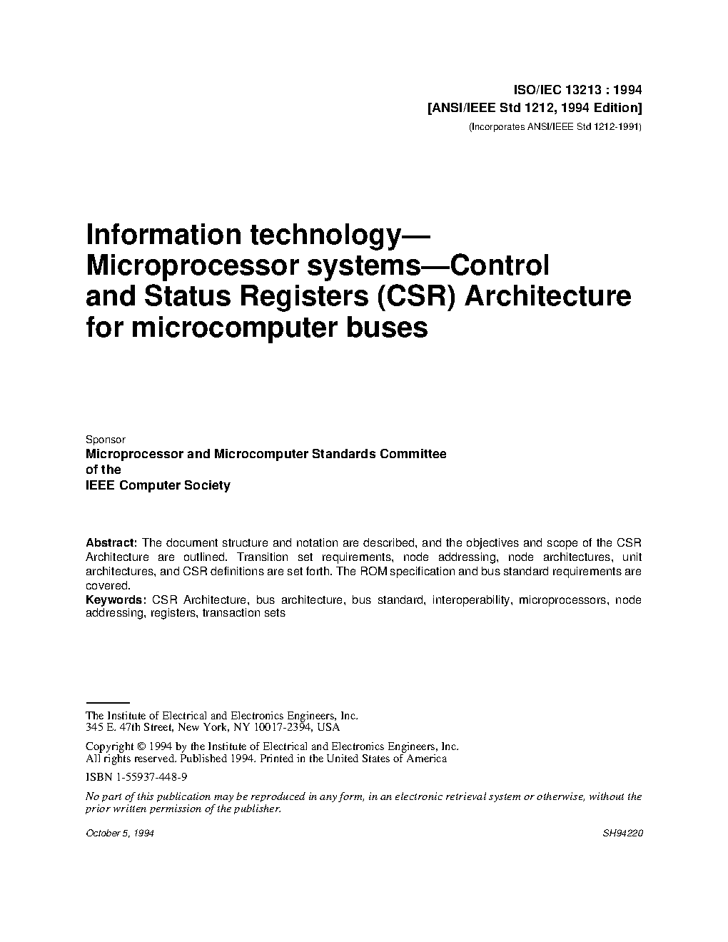 This International Standard defines the address-space maps, the bus transaction sets, and the node’s CSRs. The intention is to provide a sufficient and standard framework for the design of vendor-dependent unit architectures.