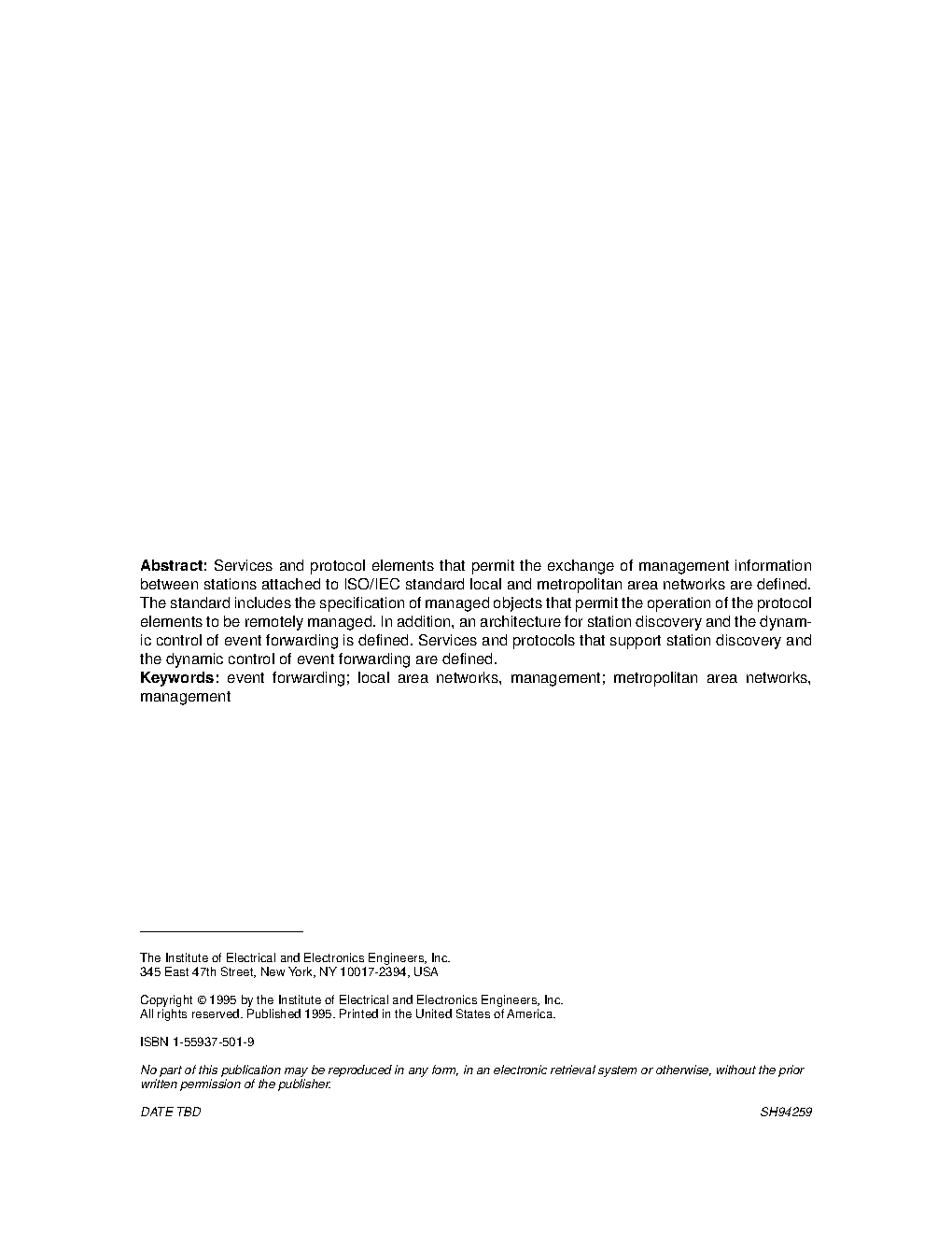 This International Standard defines an Open Systems Interconnection (OSI) management-compatible architecture, and service and protocol elements for use in a LAN/MAN environment for the purpose of performing remote management of LAN-based or MAN-based devices. The protocol described is a connectionless mode management protocol that makes use of Logical Link Control (LLC) Type 1 procedures as a means of conveying management information between stations in a LAN/MAN environment, thus providing for interworking of ISO/IEC standard LAN/MAN devices for management purposes. The management information is conveyed using the protocol data unit (PDU) formats defined in ISO/IEC 9596-1 : 1991.1.