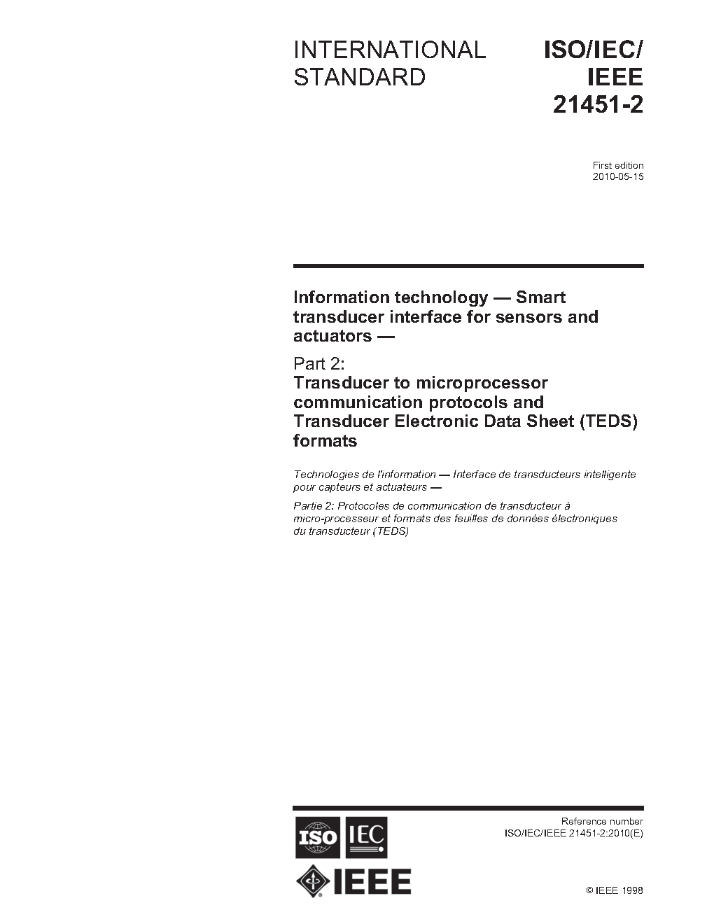 ISO/IEC/IEEE International Standard for Information technology -- Smart transducer interface for sensors and actuators -- Part 2: Transducer to microprocessor communication protocols and Transducer Electronic Data Sheet (TEDS) formats