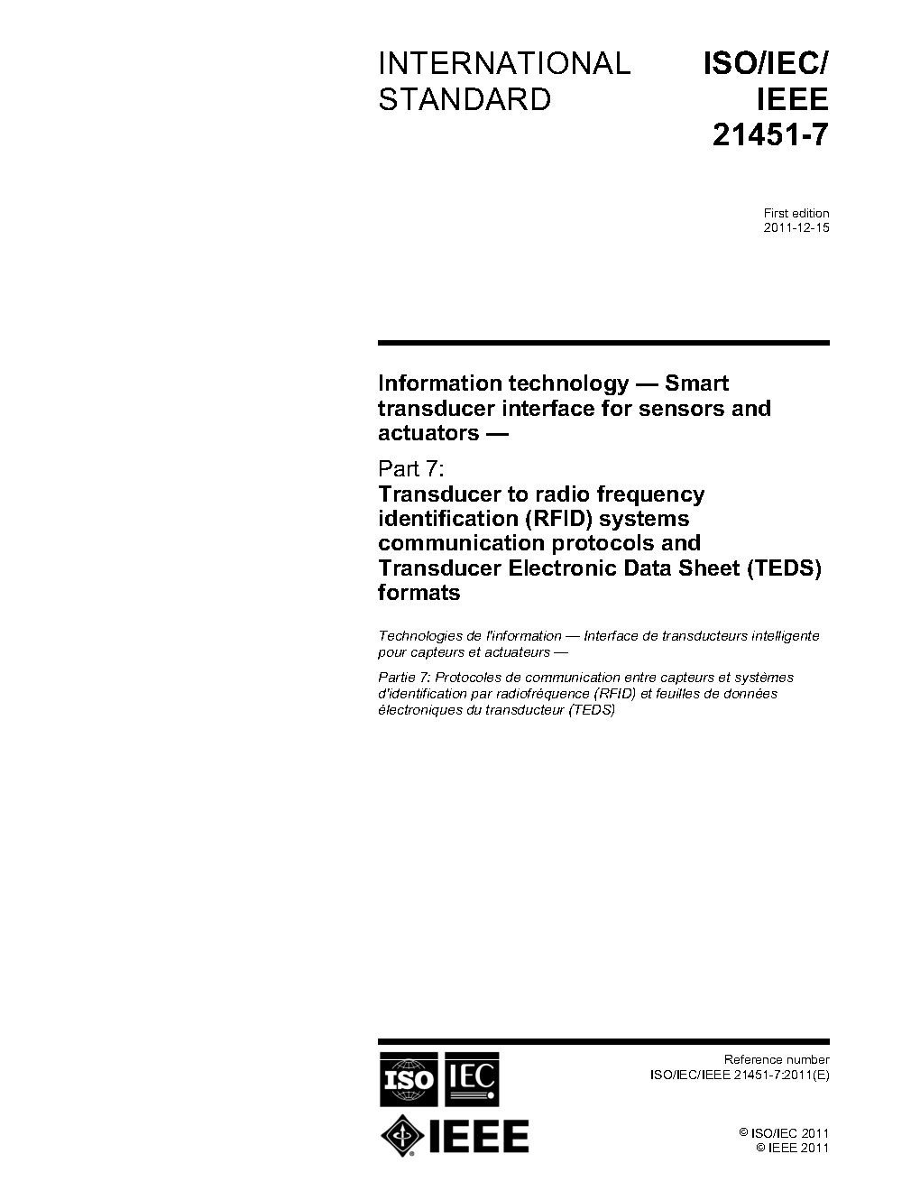 ISO/IEC/IEEE 21451-7:2011 defines data formats to facilitate communications between radio frequency identification (RFID) systems and smart RFID tags with integral transducers (sensors and actuators). It defines new Transducer Electronic Data Sheet (TEDS) formats based on the ISO/IEC/IEEE 21451 series of standards. It also defines a command structure and specifies the communication methods with which the command structure is designed to be compatible.