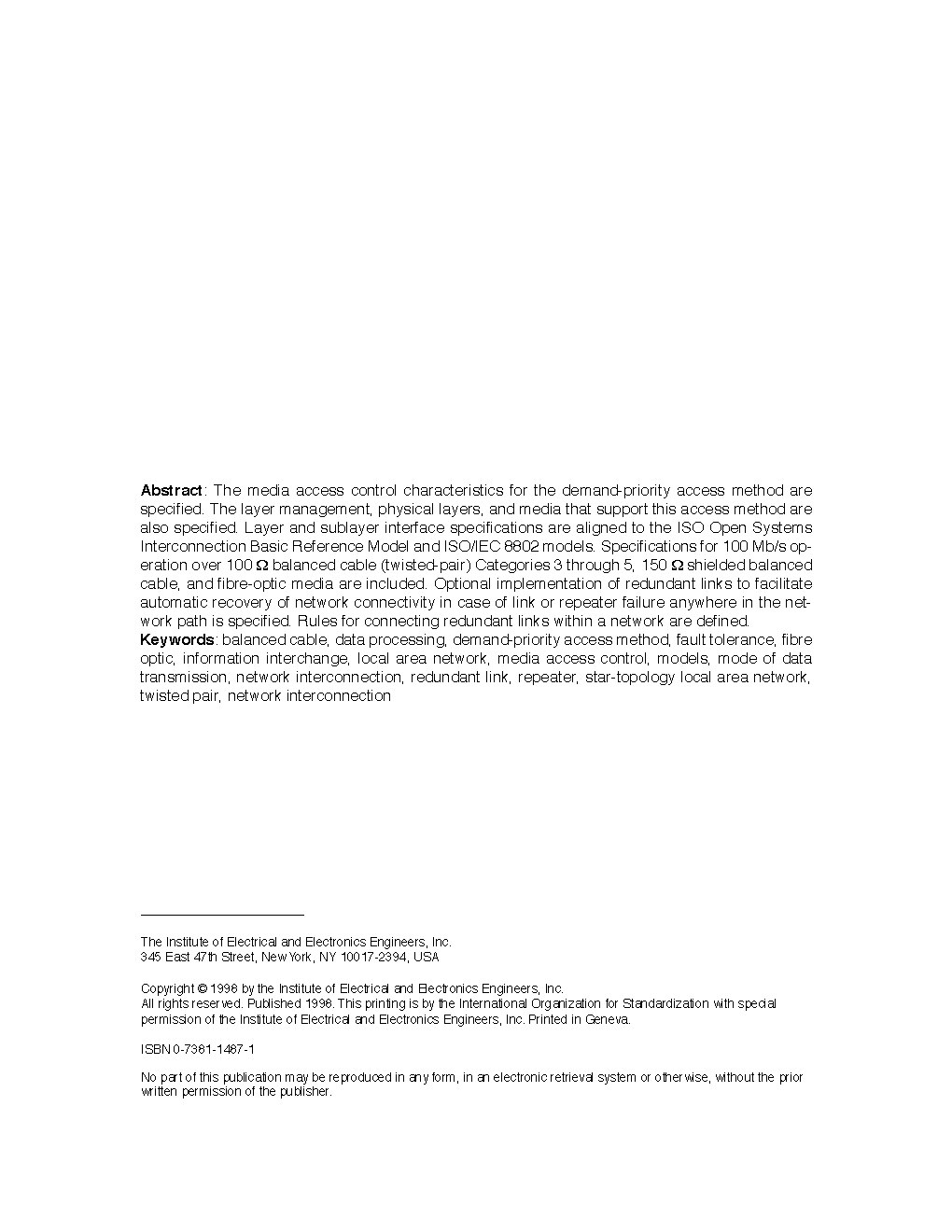 This International Standard defines the protocol and compatible interconnection of data communication equipment via a repeater-controlled, star-topology Local Area Network (LAN) using the demand-priority access method.