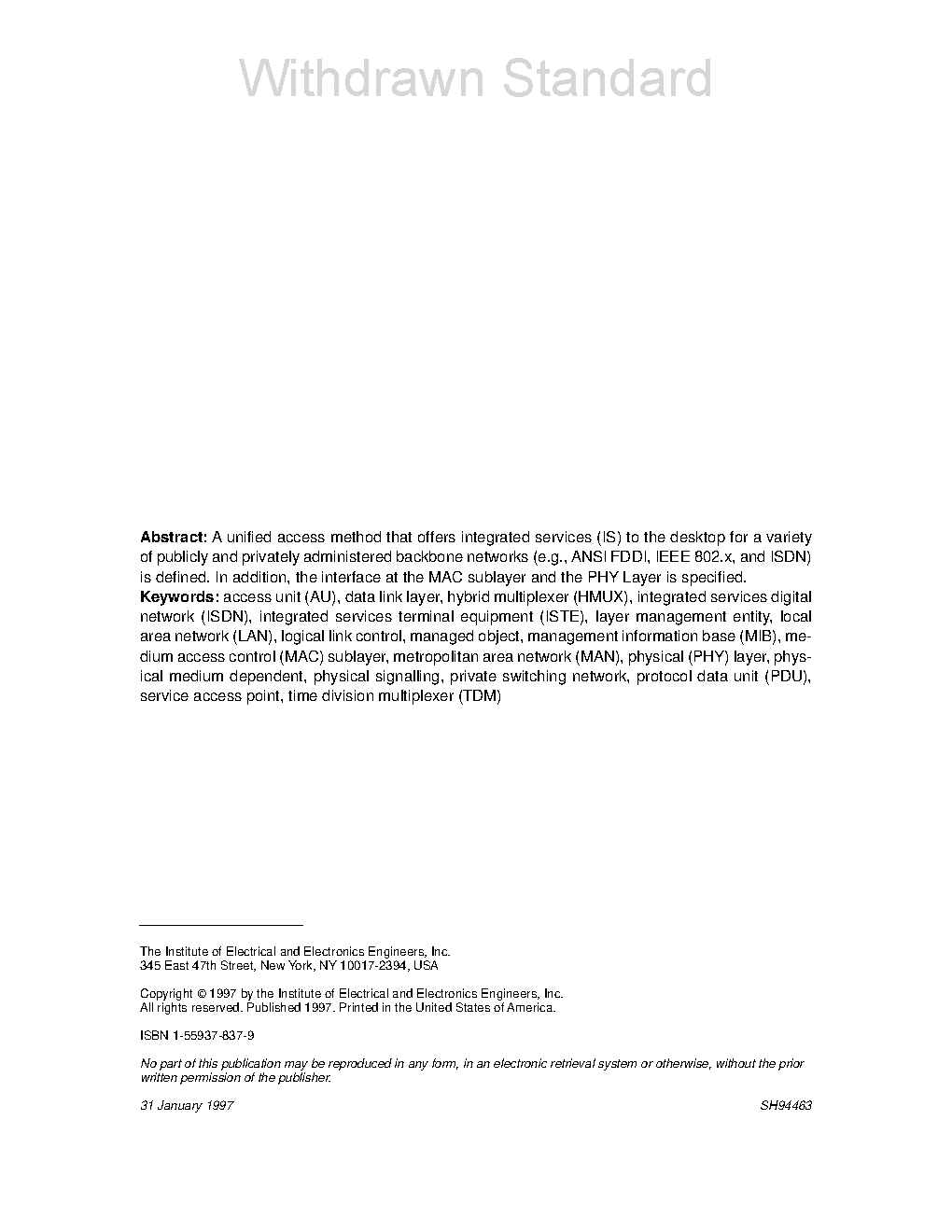 ISO/IEC/IEEE International Standard Information technology - Telecommunications and information exchange between systems - Local and metropolitan area networks - Specific requirements - Part 9: Integrated Services (IS) LAN Interface at the Medium Access Control (MAC) and Physical (PHY) Layers